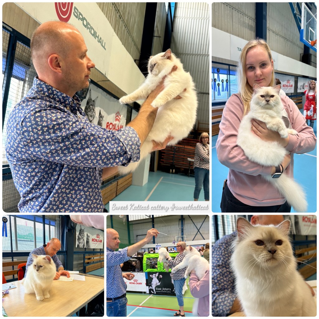 CH EE*Kevin Sweet Katicat on meil nüüd kasvanduses kõige vanem aretusisane. Ta on sündinud 25.04.2023. ja elab minu sõbranna Pireti juures. Kevin on punase tabby maskiga, suurt kasvu ja hästi leebe iseloomuga. Kevinil on juba ka kaks pesakonda järglaseid ette näidata. Sweet Katicat kasvanduses tuli ilmale kopsakas viiene R2 pesakond ja teinegi väljaspool meie kasvandust. Kevinit esitleb näitustel alati Piret ja abistaja rollis on Elise. Oleme selle pundiga juba mitmeid kordi koos osalenud ja kõik sujub kenasti. Kevin seekord algul küll veidike mauras ja oli rahutu, aga peagi rahunes. Eks ole näitusesaal ühe nooruki jaoks vägagi ahvatlusi täis koht. Kõrval puurides on ju erinevad kassid ja see tekitab ärevust. Kevinit kiitsid mõlemad kohtunikud vaatamata tema suviselt lühemale kasukale ja bikiinivormile. Meeldis eriti Kevini suurus, silmade värv ja nunnu iseloom. Otsaesine võiks tal olla pisut kumeram nagu ikka. Üks tuntud Rootsi kasvataja Lena Nordström tuli meie näitusepuuride juurde juttu puhuma ja just Kevinit vaatlema. Lena on ise ka kohtunik ja oli Tallinnas 2019 aastal Püha Birma Erinäitusel hindamas. Ta on ka punase maskiga birmasi kasvatanud ja sellepärast hakkas meie poiss kohe silma. Samuti mainis Piretile, et tal poleks ka midagi Marcela suguse tüdruku vastu. Kevin sai siis seekord näituselt avaklassis juba kolmanda CAC sertifikaadi ning on nüüd Champion tiitli omanik. Kahjuks ei olnud seekord nii head vormi, et paneeli pääseda, aga oleme tulemusega vägagi rahul (pildid allpool).